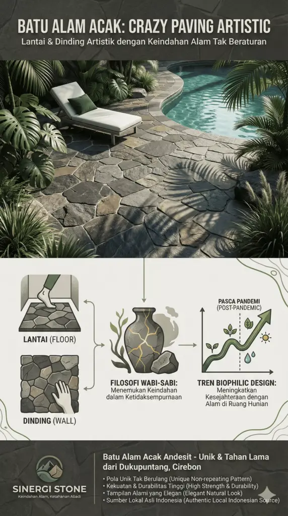 Batu alam acak, atau yang dalam dunia arsitektur global dikenal dengan Crazy Paving, merupakan pilihan inovatif untuk menciptakan tampilan lantai dan dinding yang artistik dan unik.