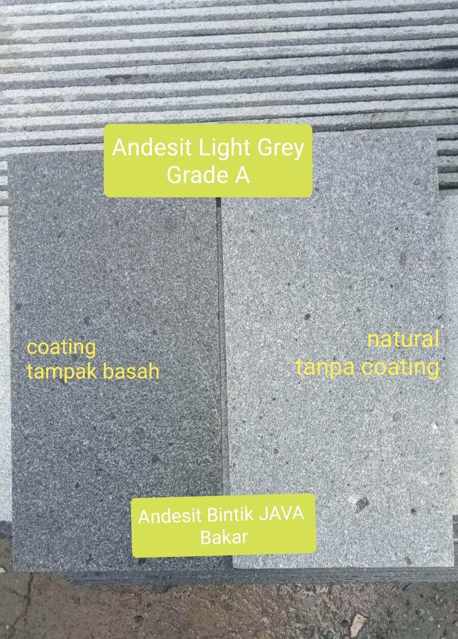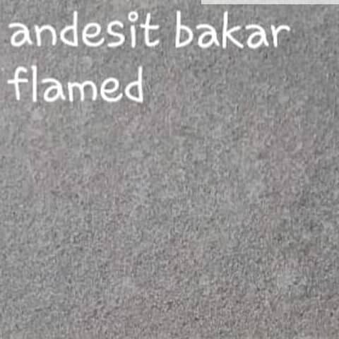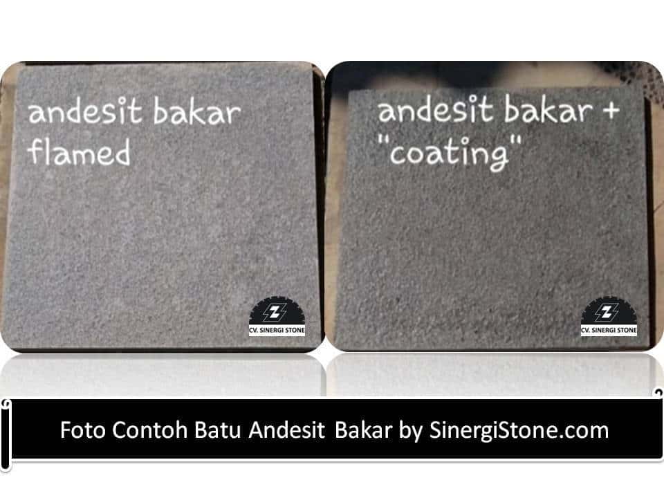- Batu andesit yang telah dipotong kemudian melalui proses pembakaran pada salah satu permukaannya.